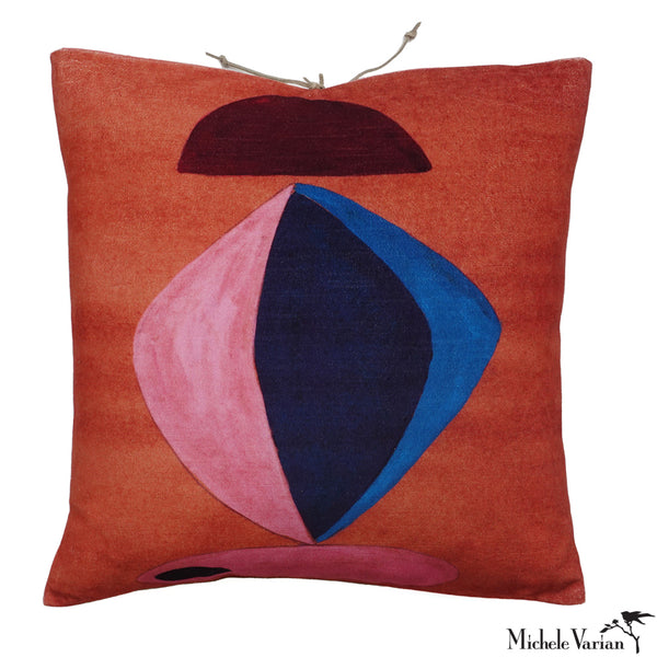 Luxury handmade decorative throw pillows made of natural fabrics, great for adding comfort and casual, laid-back style to a contemporary living room, bedroom or lounge. The modern printed graphics are from original watercolor paintings by Michele Varian. The cushion covers have a functional and decorative tie closure, and silk insert. The traditional knot tie closure at the top ensures that there are no hard elements like buttons or zippers. All pillows include a generously filled feather and down blend insert. This toss cushion is designed by Michele Varian and handcrafted in NYC.