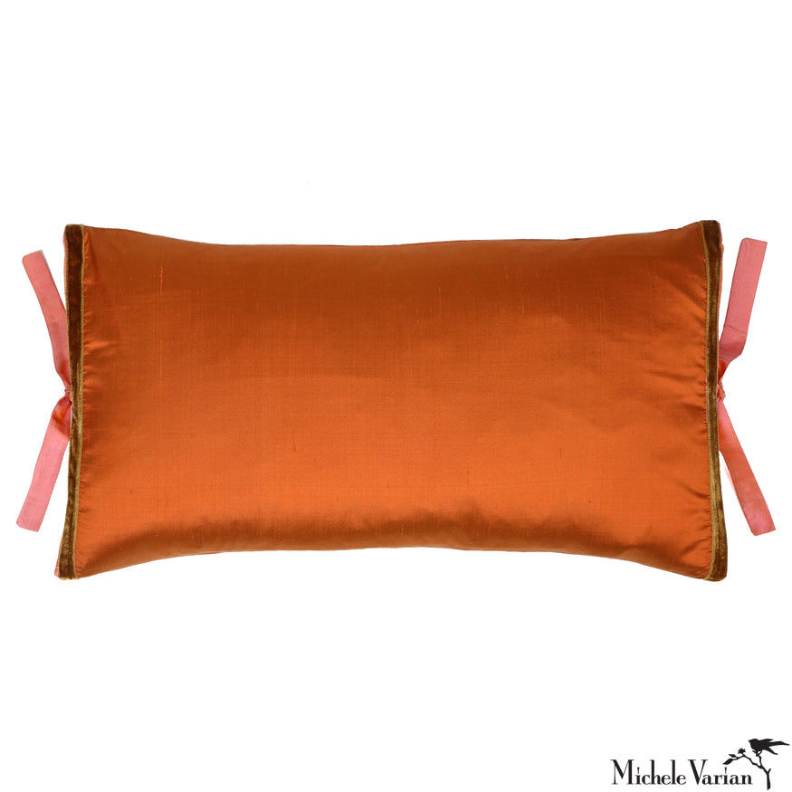 This Michele Varian cushion is made of 100 percent silk dupioni front and back. The edge is finished with a complimentary color solid velvet trim. It has a functional and decorative silk tie closure, and silk insert flap. Because of the hand made nature, slight imperfections are inherent in the fabric.