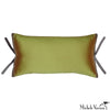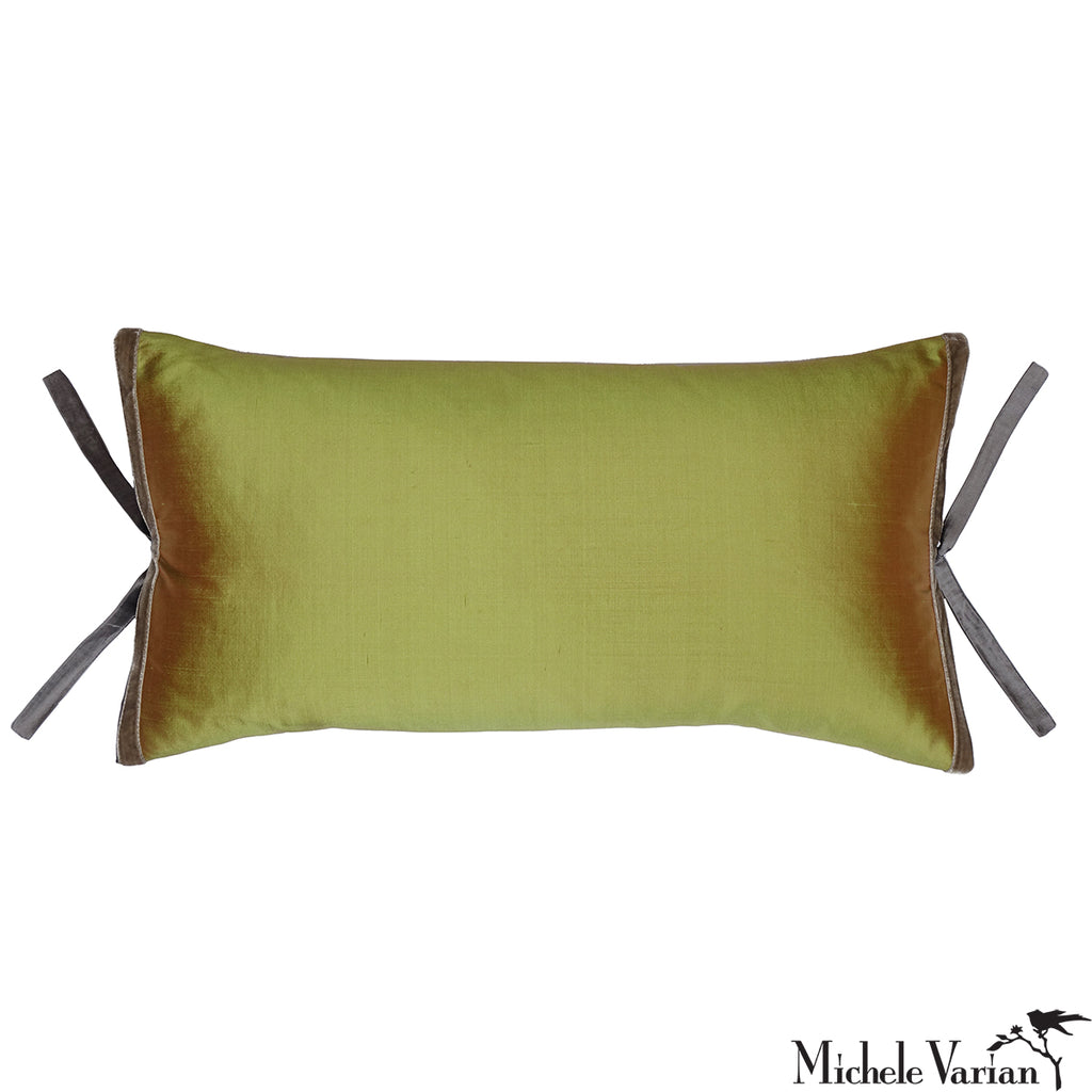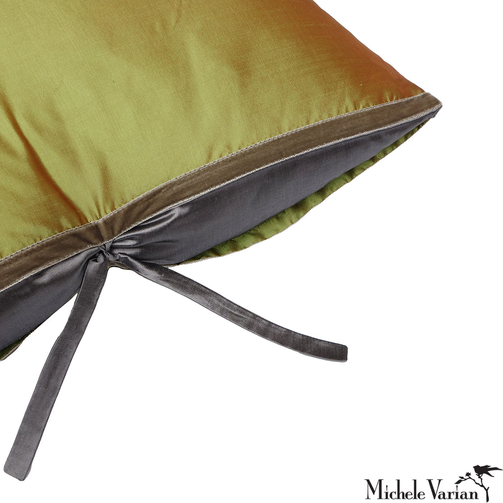 This Michele Varian cushion is made of 100 percent silk dupioni front and back. The edge is finished with a complimentary color solid velvet trim. It has a functional and decorative silk tie closure, and silk insert flap. Because of the hand made nature, slight imperfections are inherent in the fabric.
