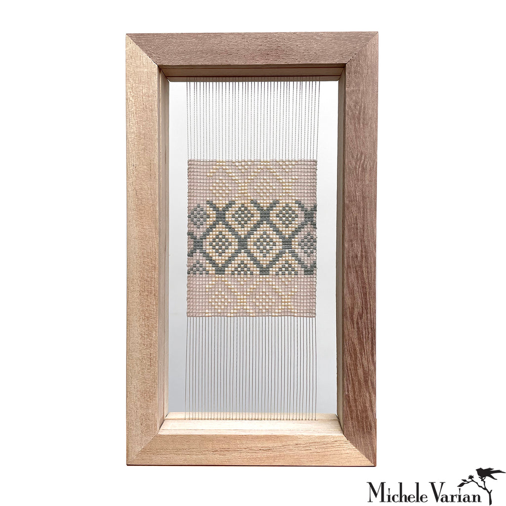 Tiny artwork made of Japanese beads that are sewn to the warp of the threads, the frames hold the threads like a loom.