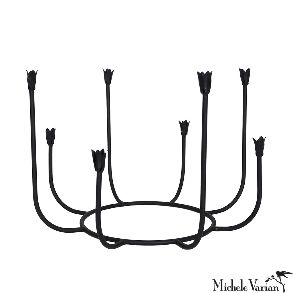 Inspired by wrought iron garden gates, our Beacon Long Stem Candelabra holds eight of our Long Stem Tapers with curved stems and tulip candle cups. Each candelabra is entirely handmade using traditional methods—unique features and imperfections are to be celebrated. Gently press or pinch candle cups to secure tapers as needed. Wipe clean with a soft cloth. Pairs perfectly with long stem candles.