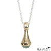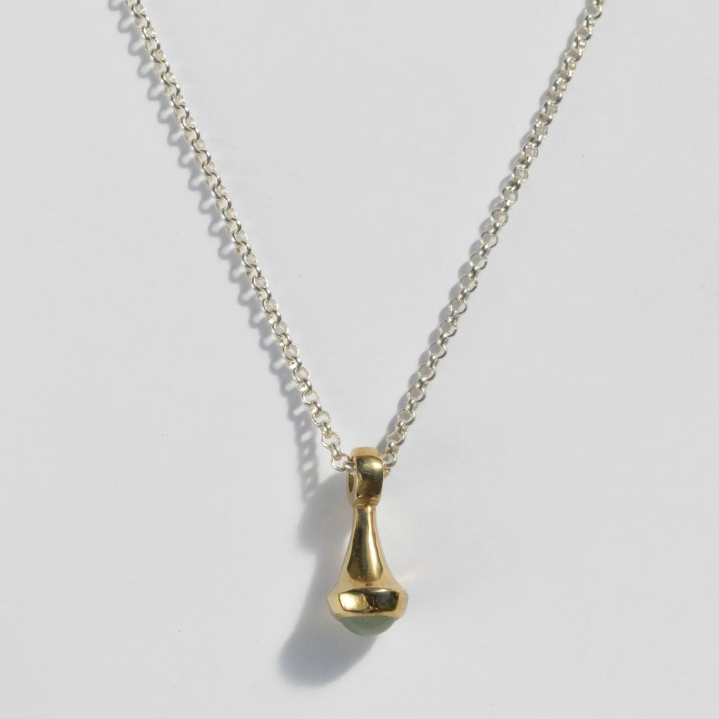 The Grete Necklace features a solid brass pendulum style pendant set with a soft green aventurine cabochon.