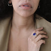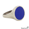 A modern stone set signet ring, with custom cut round blue lapis. Heavy bezel setting was hand carved in wax and then cast in brass