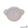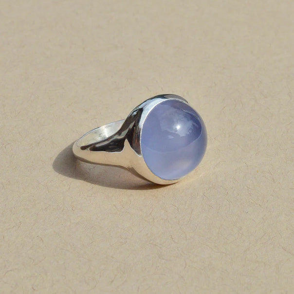 A sumptuous dome of glowing blue chalcedony set in sterling silver. Solid and ethereal all at once, this ring is truly enchanting. Heavy bezel setting was hand carved in wax and then cast in silver.