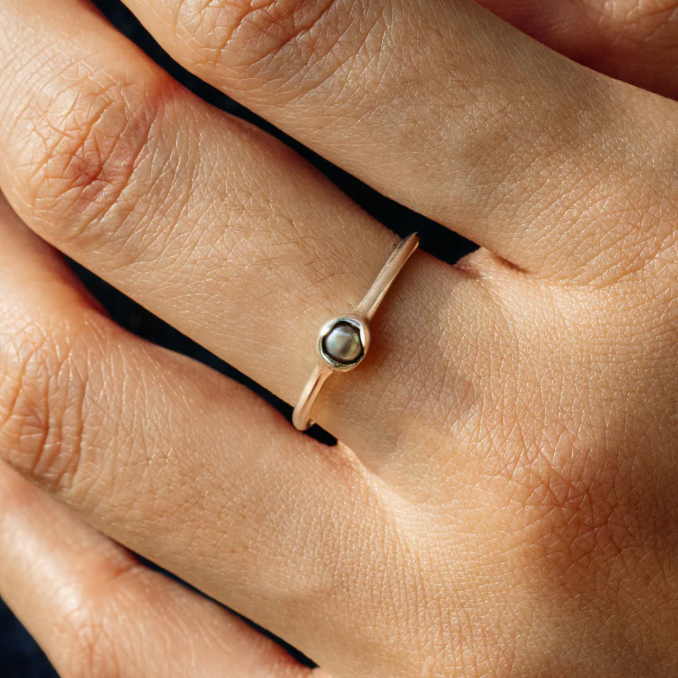 This ring is home to a lone pearl. Resting in metal that mimics organic layering to hold something beautiful and singular.