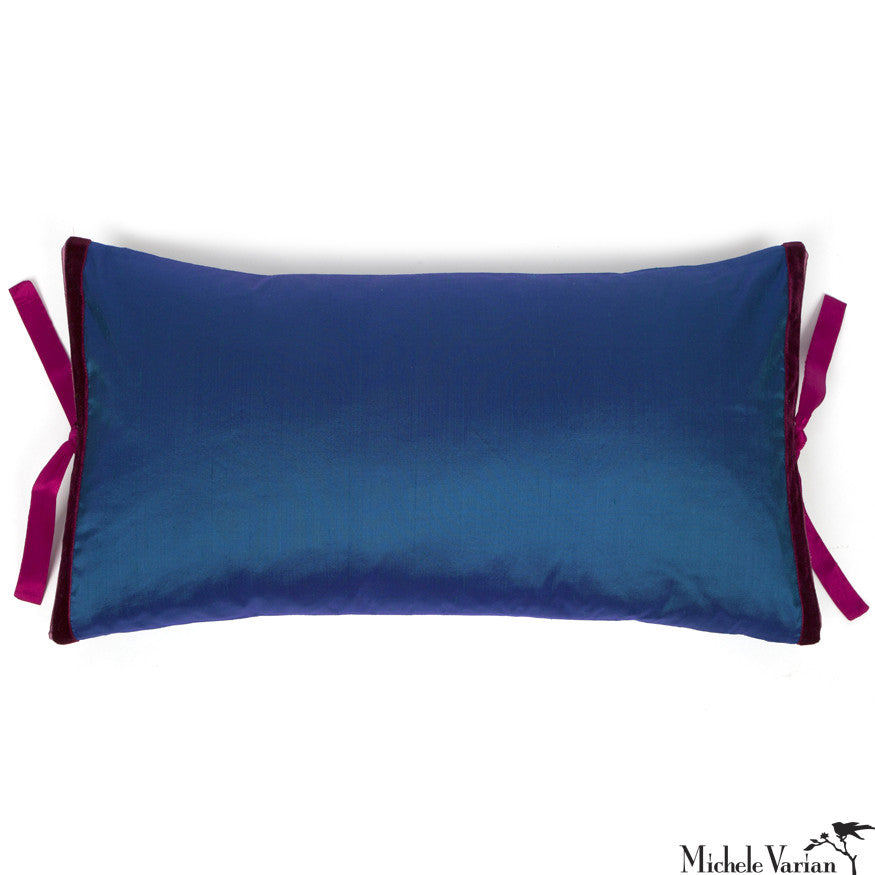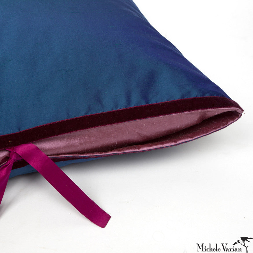 This Michele Varian cushion is made of 100 percent silk dupioni front and back. The edge is finished with a complimentary color solid velvet trim. It has a functional and decorative silk tie closure, and silk insert flap. Because of the hand made nature, slight imperfections are inherent in the fabric.