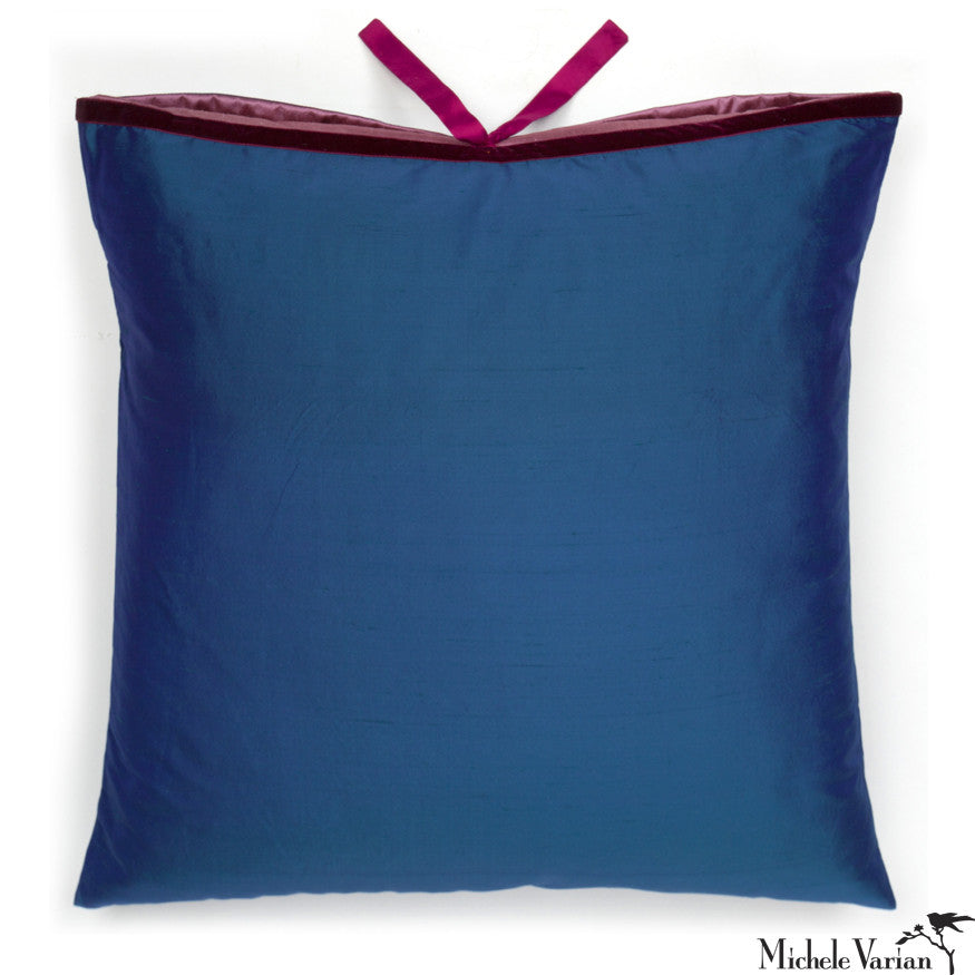 This Michele Varian cushion is made of 100 percent silk dupioni front and back. The edge is finished with a complimentary color solid velvet trim. It has a functional and decorative silk tie closure, and silk insert flap. Because of the hand made nature, slight imperfections are inherent in the fabric.