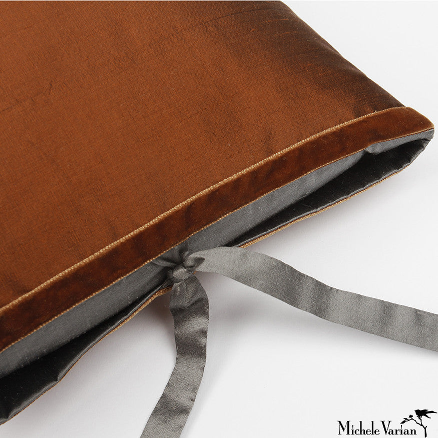 This Michele Varian cushion is made of 100 percent silk dupioni front and back. The edge is finished with a complimentary color solid velvet trim. It has a functional and decorative silk tie closure, and silk insert flap. Because of the hand made nature, slight imperfections are inherent in the fabric.