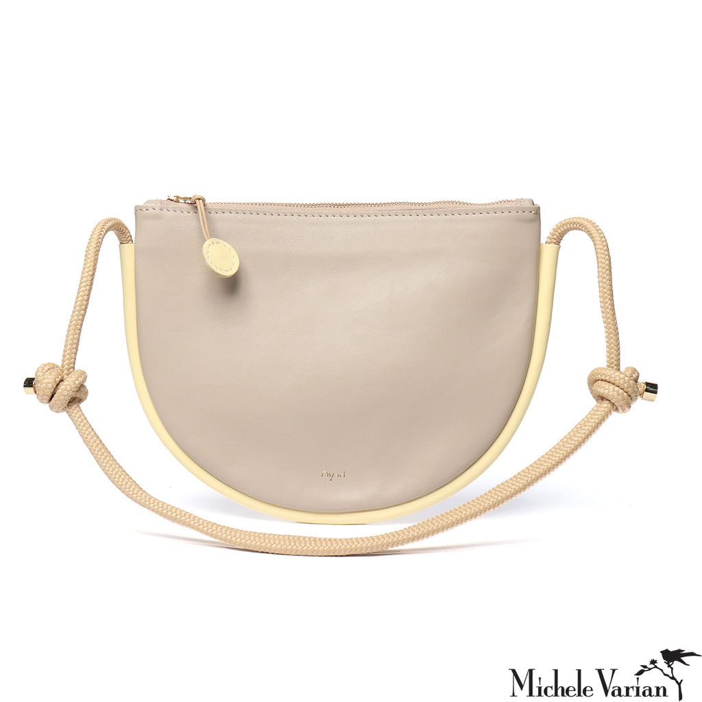 A half moon-shaped cow leather sling bag with an adjustable rope strap. The length of the strap can be adjusted by moving the knots up or down so that the bag can be worn crossbody or as a shoulder bag. The bag is slim, but large enough to fit all essentials like a large wallet or a glasses case. The rope ends are finished off with gold metal caps. The bag closes securely with a zip and comes with a small slip pocket on the inside. Gold embossed Dyad logo. YKK zip.