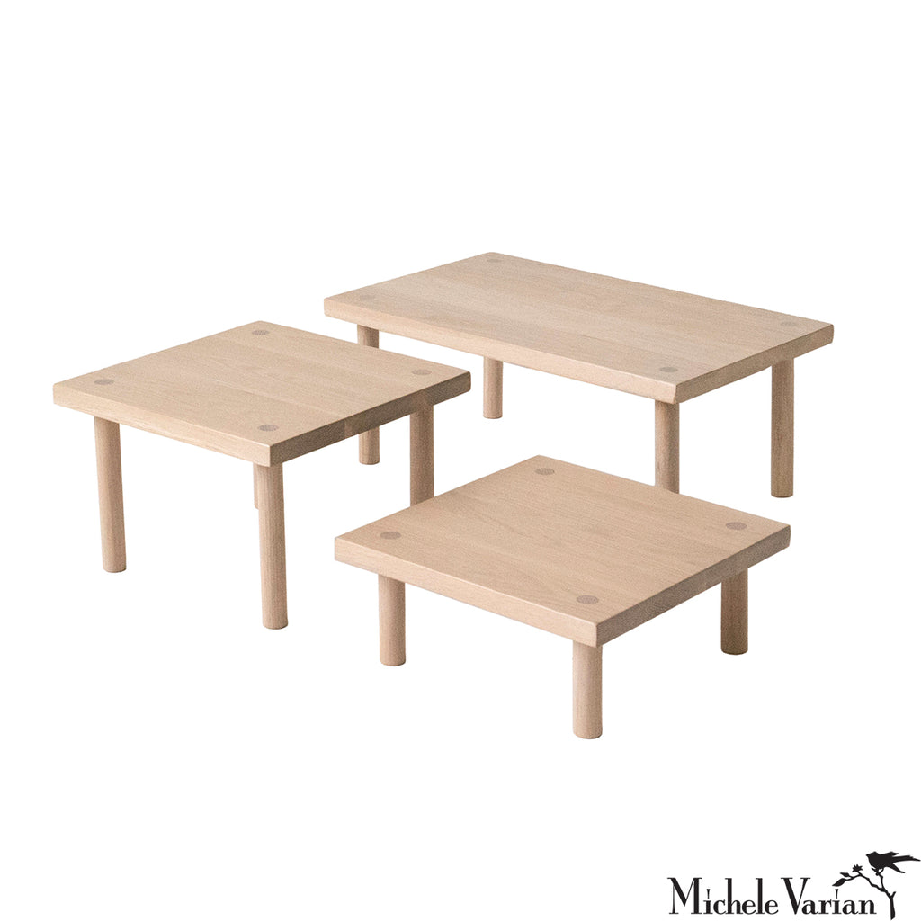 A simple, clean, and versatile stand. Can be used on the ground as a plant stand, on a shelf/desk for an additional storage level, or as a bedside table. Stack or nest them to build a custom surface.