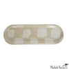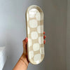 A speckled stoneware ceramic vanity tray, perfect for your bathroom counter or dresser top. Made from speckled stoneware clay with hand-cut porcelain squares inlaid into the stoneware surface, creating a checkered pattern in the clay's surface. The tray is then glazed in a clear coat. This tray is food safe but should be washed by hand.