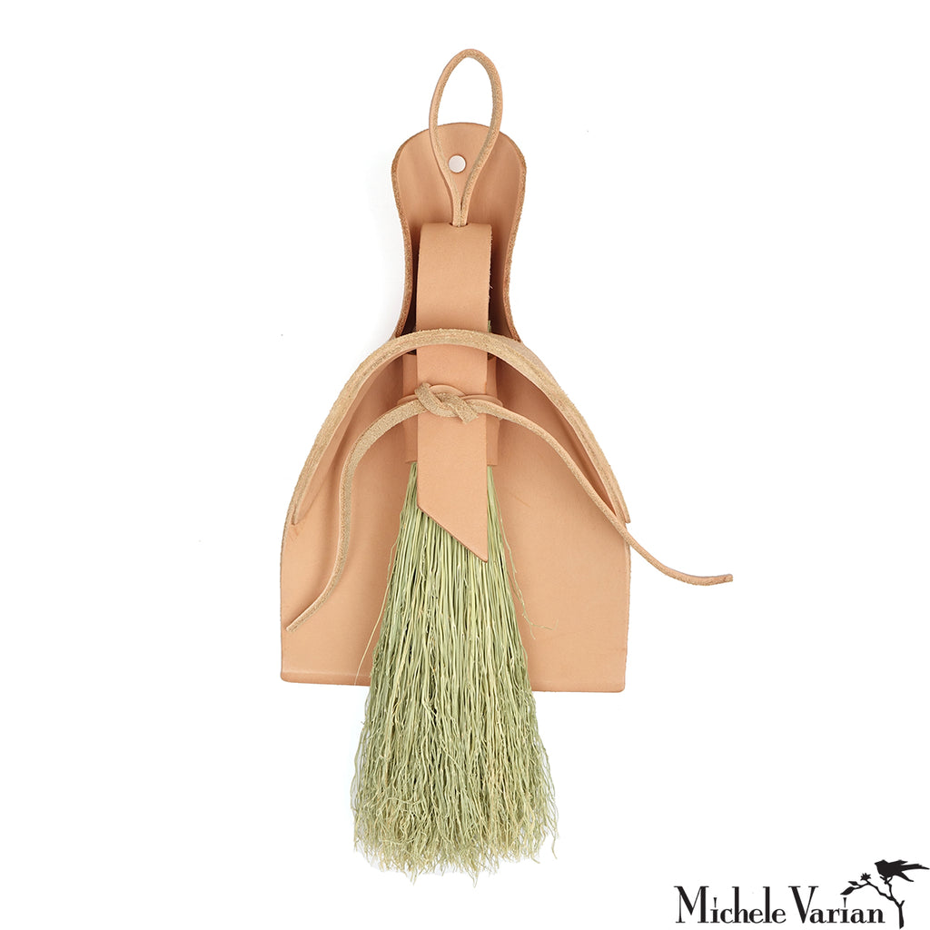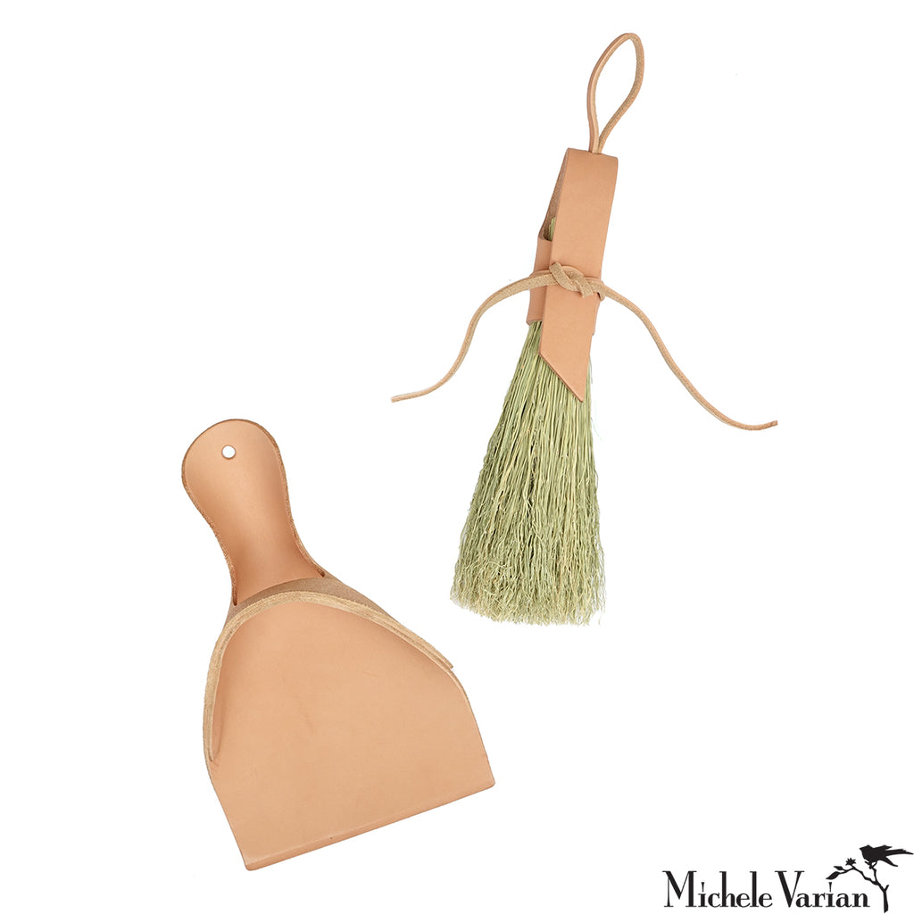 - Dimensions: broom: 12.5 x 5.5 x 2.5 | leather dust pan: 10.5 x 6.75 inches