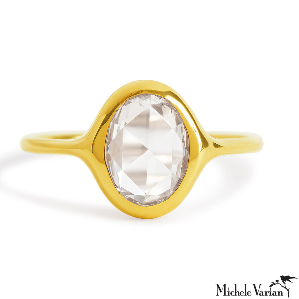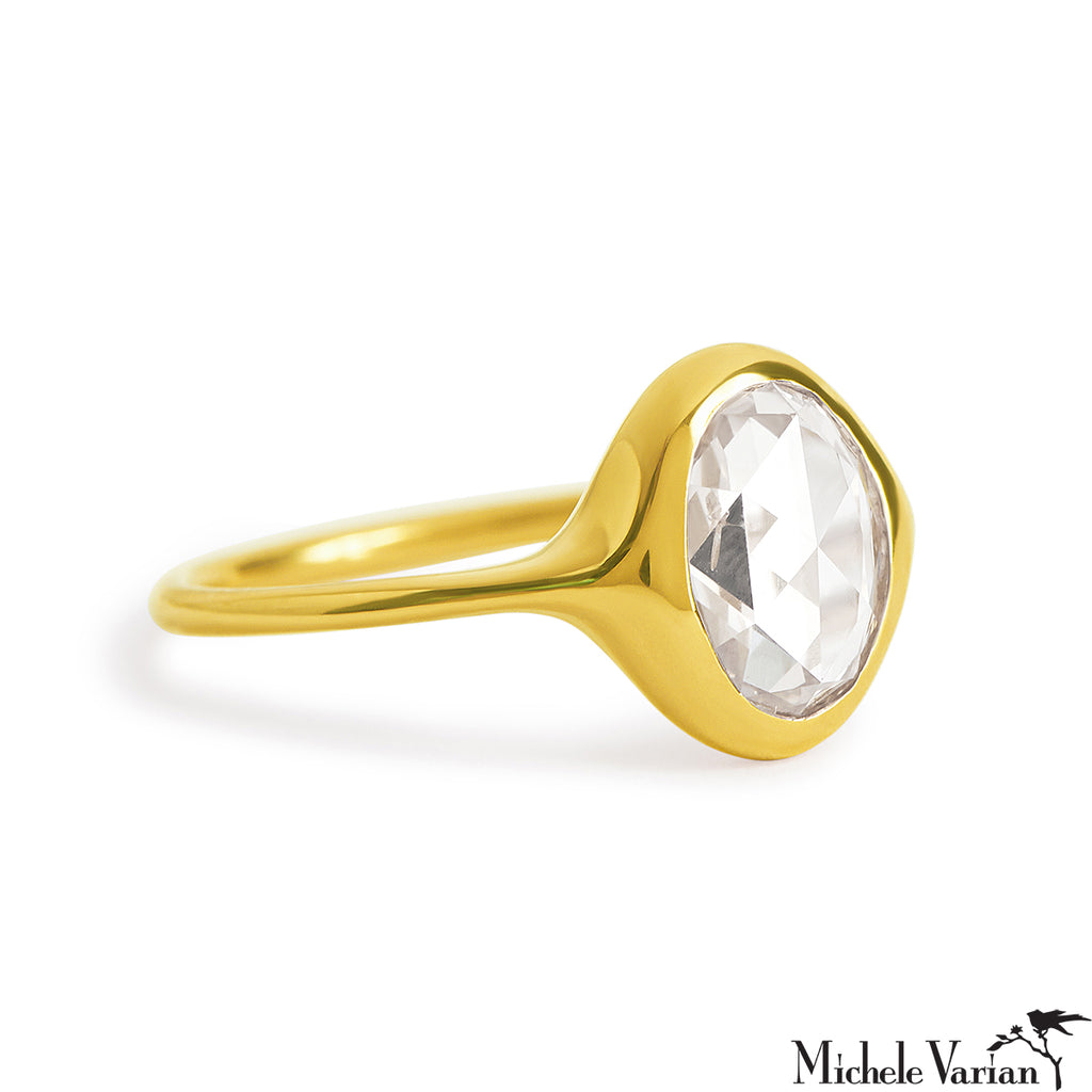 This sweet and sparkly diamond ring features a an oval rose cut diamond set in a modern yet classic hand crafted setting.