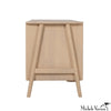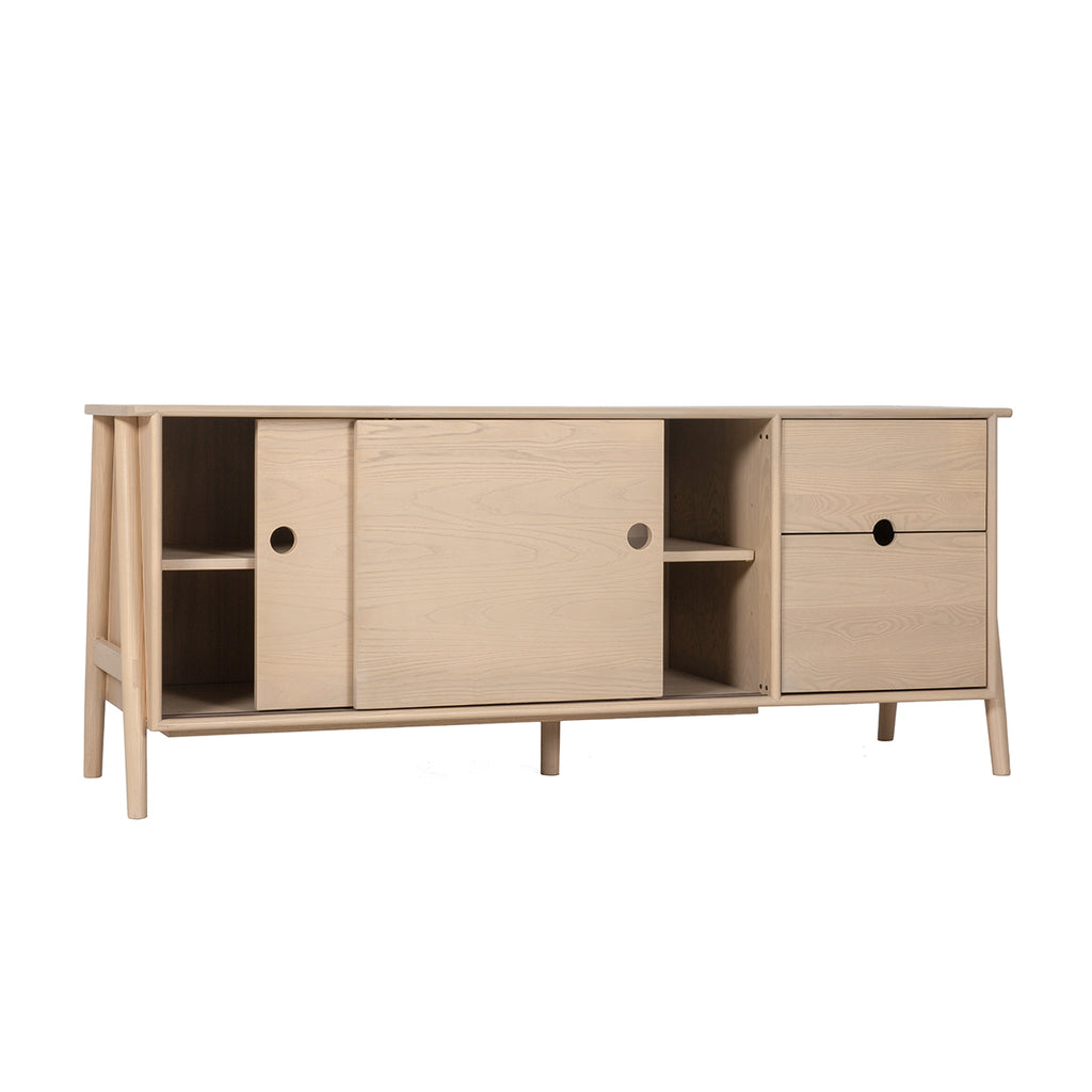 The Woodbine Sideboard is a solid white oak sideboard for media or storage. For this piece we tried to reveal the inner workings of the sideboard, moving the legs to the outside of the piece to expose the joints and create an inside-out look. The sliding doors on the left reveal two shelves for storage. The bottom contains a small hole for cables.